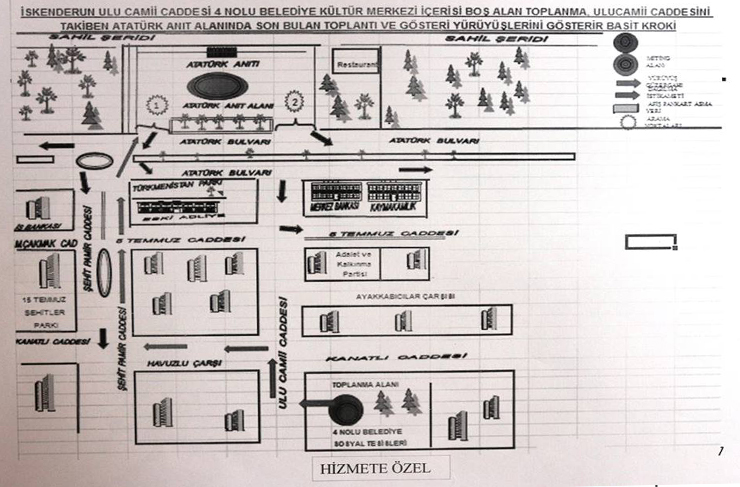 1-Çay Mahallesi Tayfur Sökmen Bulvarı 3M Garden önündeki boş alanda toplanarak, Çay Mahallesi Tayfur Sökmen Bulvarı-Atatürk Bulvarını takiben Atatürk Anıt Alanı istikameti yürüyüş güzergahından, Sahil Atatürk Bulvarı üzeri Atatürk Anıt Alanı Miting Alanı, Toplantı sonunda Atatürk Bulvarı, Ulucami Caddesi, Şehit Pamir Caddesi dağılmaya açık tutulur.