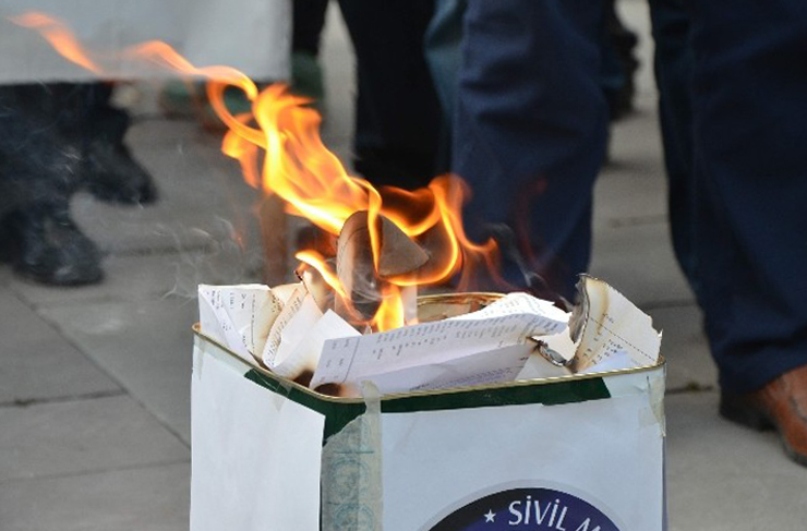Geçtiğimiz hafta sonu Mal Müdürlüğü önünde toplanan Sivil Memurlar Sendikası (Sime-Sen), üyesi yaklaşık 150 sivil memur, maaş bordrolarını yakarak TSK Yan Ödeme Kararnamesi’ndeki kararlara tepki gösterdi.