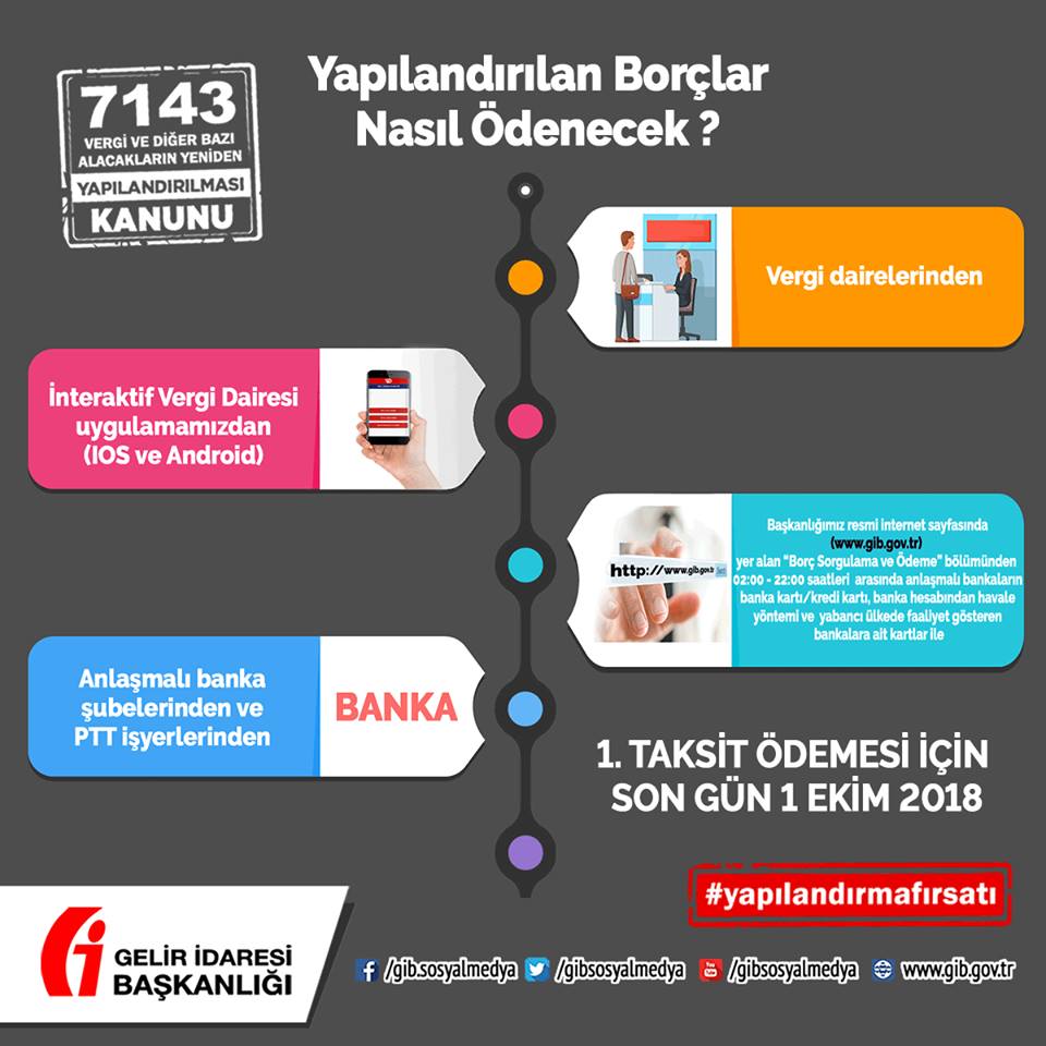 7143 sayılı Yapılandırma Kanunu kapsamında yapılandırılan borçların peşin ödeme veya 1. taksit ödemeleri için bugün son gün. Vatandaşların vergi dairelerinde ödemelerde sıkıntı yaşamaması için ödemeler, vergi dairelerinin veznelerinin yanı sıra www.gib.gov.tr internet sayfasından, İnteraktif Vergi Dairesi uygulamasından, GİB Mobil uygulamasından, anlaşmalı bankalardan da yapılabilecek.