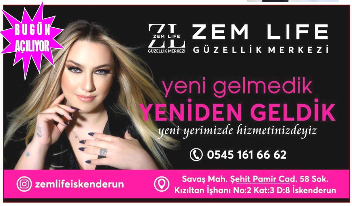 Cilt bakımından, kalıcı makyaja, dudak renklendirmeden laser uygulamalarına kadar güzellik ve bakım odaklı pek çok hizmeti bünyesinde barındıran Zem Life Ailesi; “En büyük başarı, bir adım atmaktır. Bizler bu zorlu mücadeleyi atlatıp sizlere en iyi hizmeti sunmak adına yeniden karşınızdayız. Zem Life ailesi olarak sizleri yeni yerimizde ağırlamaktan mutluluk duyarız” diyerek tüm İskenderunluları 16 Ağustos 2023 Çarşamba Günü (Bugün) gerçekleştirilecek açılışlarına davet etti. (Haber: Helga TERBİYELİ)
