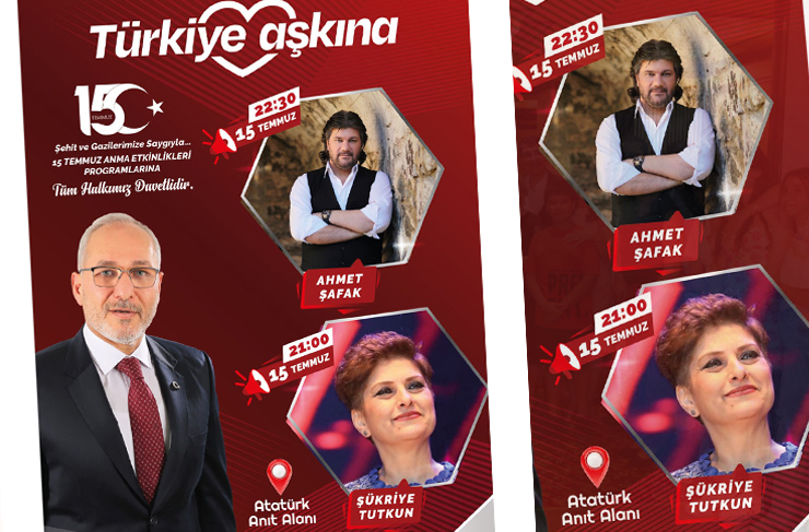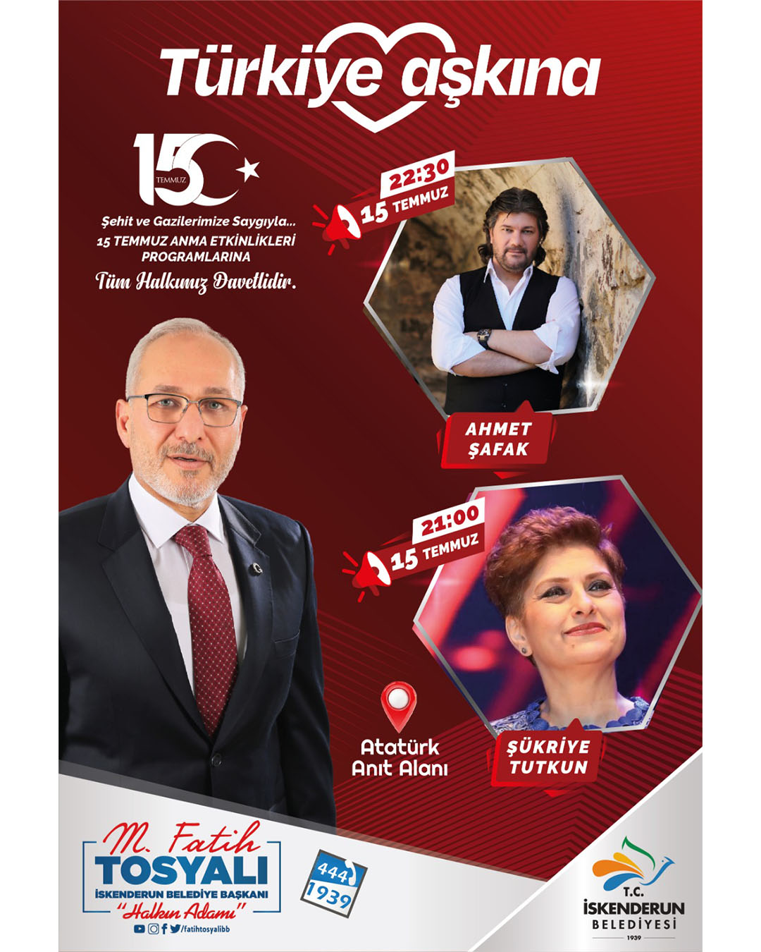 15 Temmuz 2022 Cuma akşamı saat 21.00’da Atatürk Anıt Alanında, sevilen sanatçı Şükriye Tutkun hemen ardından saat 22.30’da ise ünlü şarkıcı Ahmet Şafak sahne alacak. Tutkun ve Şafak, sevilen şarkılarını İskenderunlular için söyleyecek. (Haber: Helga TERBİYELİ)