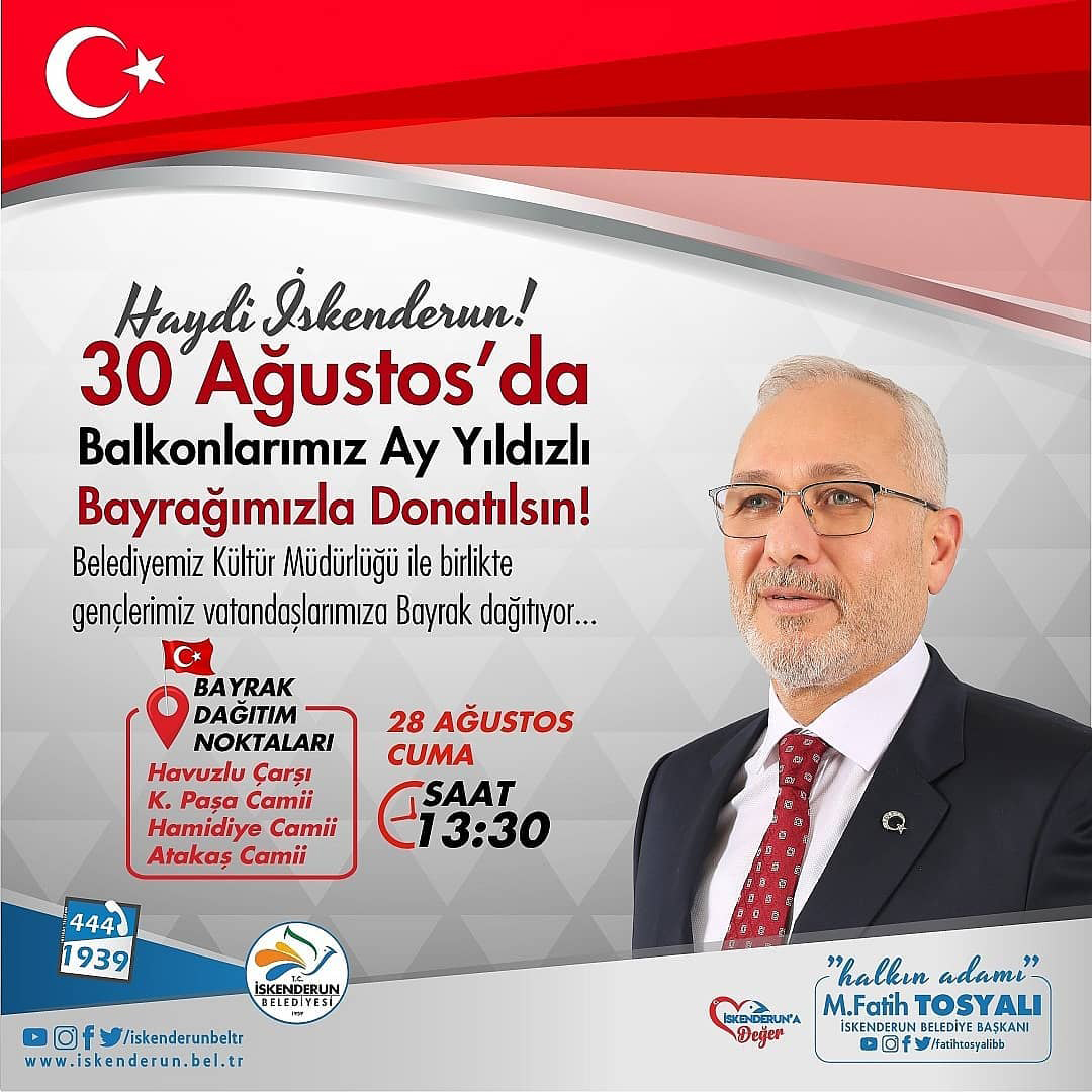 30 Ağustos Zafer Bayramını milletçe birlik ve beraberlik içerisinde büyük bir gurur ve coşkuyla kutlayacaklarını belirten Belediye Başkanı Fatih Tosyalı; “Haydi, İskenderun 30 Ağustos’ta evlerimiz ve işyerlerimiz şanlı Ay Yıldızlı Bayraklarımızla Donatılsın. Bu çerçevede Belediyemiz Kültür Müdürlüğü ile birlikte gençlerimiz vatandaşlarımıza 28 Ağustos Cuma günü saat 13.30’da bayrak dağıtacak. Bayrak dağıtım noktalarını ise havuzlu çarşı, Kaptan Paşa Cami, Hamidiye Cami, Atakaş Cami olarak belirledik.