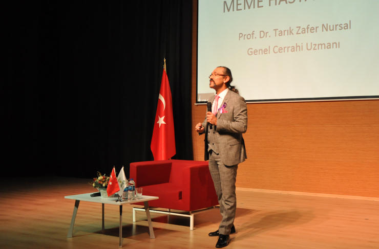 Konuşmasına, 8 Mart Dünya Emekçi Kadınlar Günü’nü kutlayarak başlayan Prof. Dr. Tarık Zafer Nursal, kadınlarda görülen en yaygın kanser türü hakkında bilgiler verdi. Nursal; “Memenin içerisinde üç ana doku vardır. Süt üreten doku, destek bağ dokusu ve aradaki boşlukları dolduran yağ dokusudur. Memede görülen her hastalık, bu üç dokudan kaynaklanır. Kanser kendi hücrelerimizden gelişir. Bu nedenle bedenimizin bağışıklık sistemi, kanser hücresini yabancı olarak algılamaz. Algılamadığı için de kanser hücreleri, üreyip çoğalmaya devam eder. Her sekiz kadından biri meme kanserine yakalanmaktadır. Bu oranı azaltacak bir tedavi yöntemi yoktur.