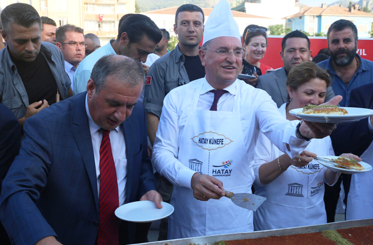 Kutlu zaferin 80. yılına özel 80 metre uzunluğunda yapılan künefe, Atatürk Park’ında sergilendi. Kentle bütünleşmiş leziz tatlı künefenin ilk şerbetini, Hatay Vali Yardımcısı Aydın Tetikoğlu, CHP Hatay Milletvekili Mehmet Güzelmansur ve Hatay Büyükşehir Belediye Başkanı Doç. Dr. Lütfü Savaş döktü.