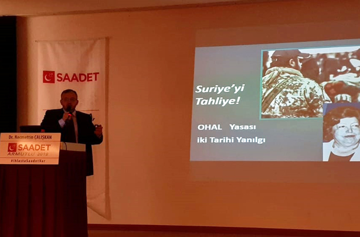 Suriye operasyonlarının terör sıkıntısını def etmek için yapılması gerektiğini ancak Suriye harekatları üzerinden siyasi rant elde etme çabasını eleştiren Çalışkan; “Keşke bugünlere gelinmeseydi de hem Erbakan hocanın 2003 yılında yaptığı konuşma hem Saadet Partisi heyetinin savaşın başladığı ilk yıllarda Suriye ziyaretindeki ikazları dikkate alınsaydı” dedi.