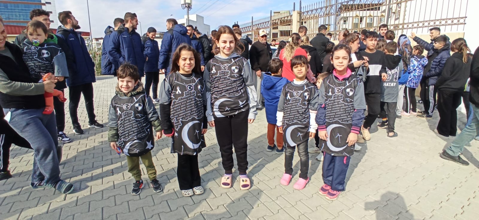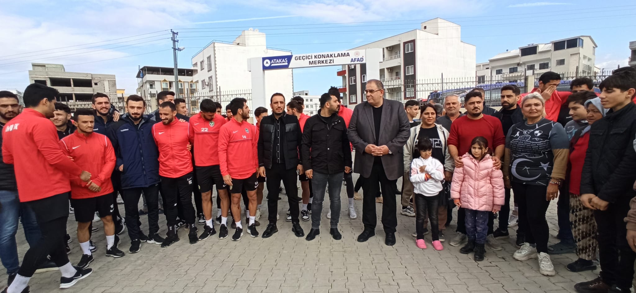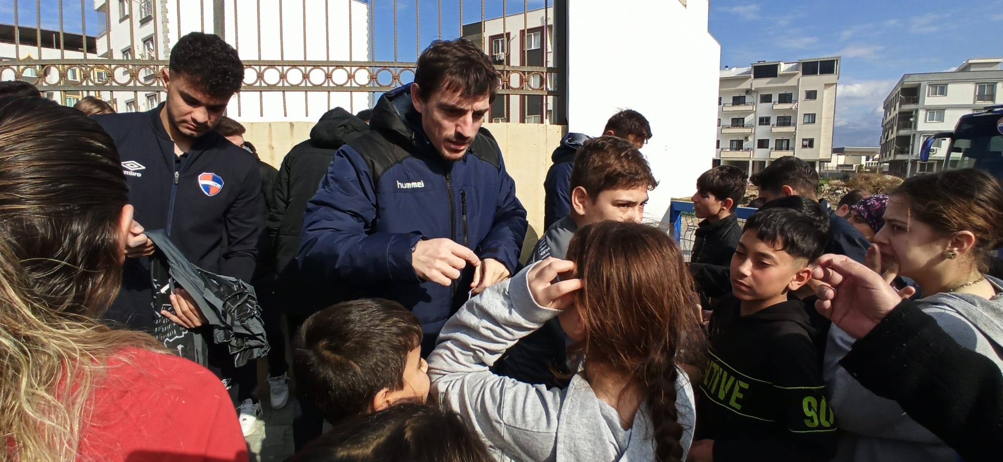 İkinci lig kırmızı grupta Pazar günü Kırıkhan’da karşılaşacak lig maçı için Hatay’da bulunan AMED Sportif Faaliyetler Kulübü teknik heyet ve sporcular, Turuncu-mavili takımla birlikte İskenderun Teknik Üniversitesi yerleşkesinde bulunan Atakaş konteyner kentte kalan depremzedeleri ziyaret etti. Her iki takımın sporcuları bir daha böyle acıların yaşanmaması dileğinde bulunarak çocuklara forma hediye etti, onlarla zaman geçidiler.
