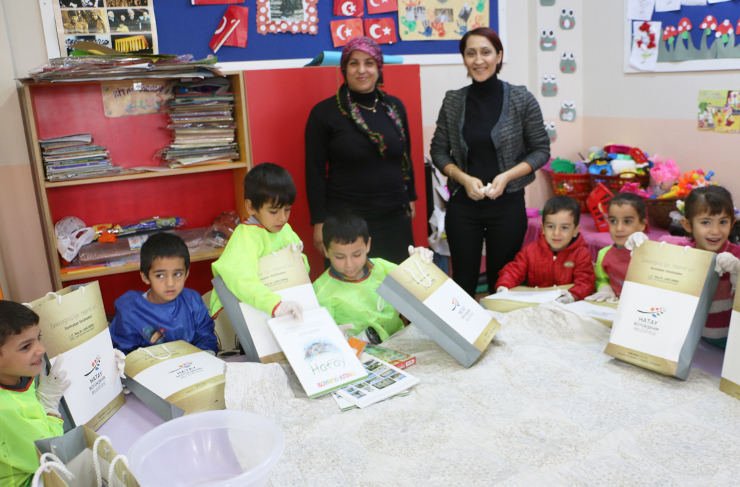 Hatay Büyük Şehir Belediyesi ekipleri bu kapsamda İskenderun ilçe merkezindeki Barbaros mahallesinde bulunan Emine Sadık Çarmıklı ve Meydan mahallesindeki Selahattin Alanya ilköğretim okullarındaki ana sınıfı öğrencilerine içerisinde boyama kitabı, karalama defteri, sulu boya takımı, elişi çalışmalarında kullanılan araç gereç ile mini termostan oluşan hediye paketlerini dağıttılar.