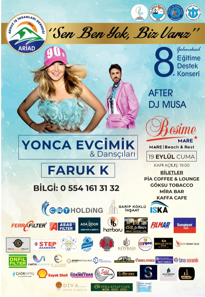 Arsuz’da Besime Mare’de gerçekleştirilecek olan konser etkinliği ile ilgili açıklamalarda bulunan Arsuz İş İnsanları Derneği Yönetim Kurulu Başkanı Adnan Ağır; “Geleceğimiz olan genç öğrencilerimiz için 8. Eğitime destek konserimiz 19 Eylül Cuma günü Arsuz Besime Mare’de gerçekleşecek.