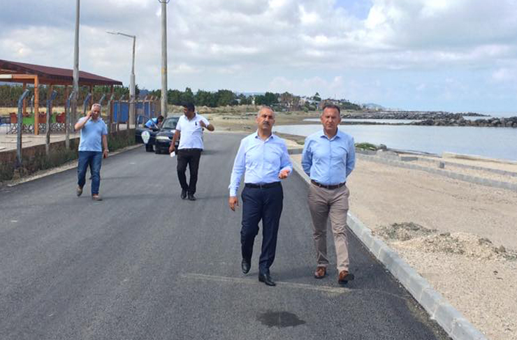 Karaağaç Mahallesi’nde Arsuz’un eski ‘Rhosus’ adıyla isimlendirilen ve projedeki tasarımının eşdeğeri olarak tamamlanma noktasına gelen iki adet sosyal tesisi birbirine bağlayacak olan sahil yürüyüş yolundaki çalışmalar hakkında yardımcısı Sedat Deveci ve Fen İşleri Müdürü Aşkın Yetimoğlu’ndan bilgiler alan Başkan Culha, sahil yürüyüş yolu ve tesislere bağlantı yolu asfalt çalışmalarının hızla sürdüğünü ifade etti.