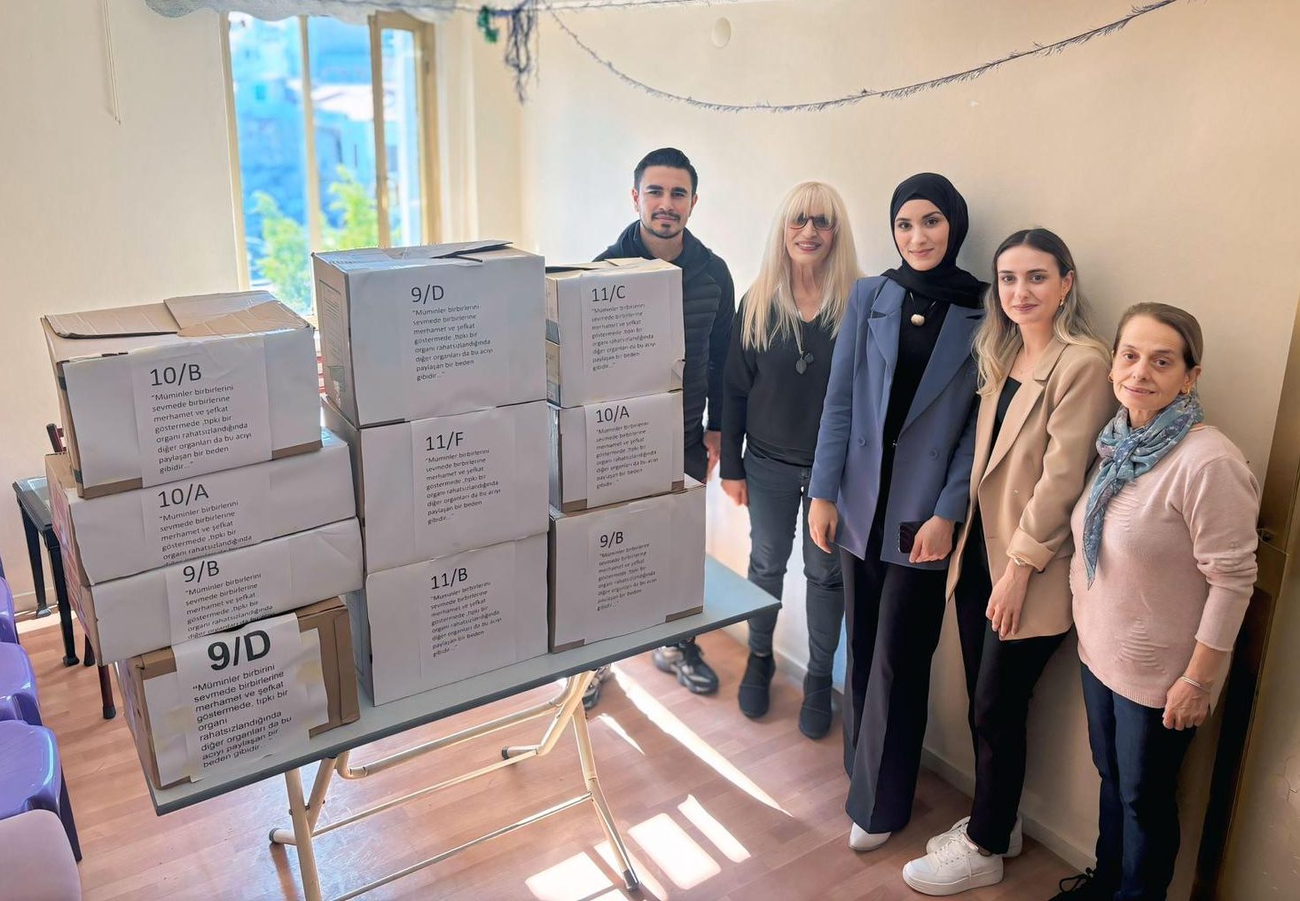 Okul Müdürü Deniz Karaoğlan ve Din Kültürü ve Ahlak Bilgisi öğretmenleri Berivan Can ve Nisa Yaren Öztürk’ün önderliğinde; 9.-10.-11. ve 12. sınıf öğrencilerinin katkılarıyla hazırlanan koliler, İskenderun Çocuk ve Gençleri Destekleme Derneği Başkanı Zeynep Çakmaklı ve yönetim kurulu üyelerine teslim edildi.