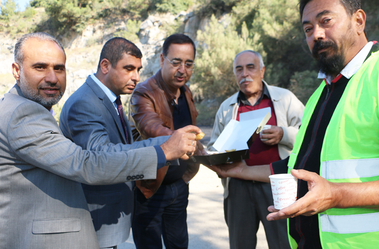 Bu arada çalışmaları yakından takip eden ve memnuniyetlerini ifade eden Denizciler beldesi eski belediye başkanı Esabil Soydan ile taşıma kooperatifi başkanı Selahattin Girgeç, işçilere ikram ettikleri baklava ile moral verdiler. Yapılan çalışmaların ulaşıma büyük katkı sağlayacağını kaydederek Büyükşehir Belediye Başkanı Doç. Dr. Lütfü Savaş’a teşekkürlerini bildirdiler.