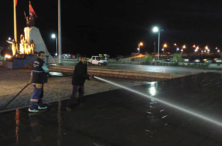Temizlik İşleri Müdürlüğümüzün koordinesinde, İtfaiye ekipleri ve Envitec personelleri tarafından Atatürk anıt alanı tazyikli su ile yıkandı. İskenderun Belediye Başkan yardımcısı Halim Öztaş, araç ve yaya trafiğinin aksamaması için çalışmaların gece saatlerde yapıldığını belirtti.