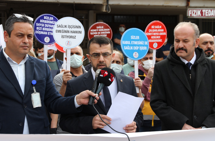 Sağlık Bakanlığı’nda çalışan 170 bin sağlık işçisinin yetkili sendikası olarak; sağlık işçisinin emeğinin hakkını istiyoruz, bizlerin de sağlık çalışanı olduğumuz gerçeğinin şartsız kabulünü istiyoruz. Bizleri mali haklar üzerinden birbirimize düşürmeyin, bizler işyerlerindeki çalışma barışını korumaya çalışırken, eylem ve söylemlerle bu birlikteliği baltalamayın” diyerek sözlerini tamamladı. (Haber: Helga TERBİYELİ)