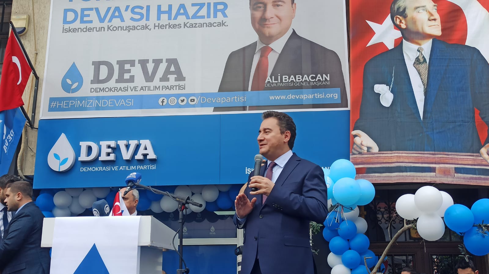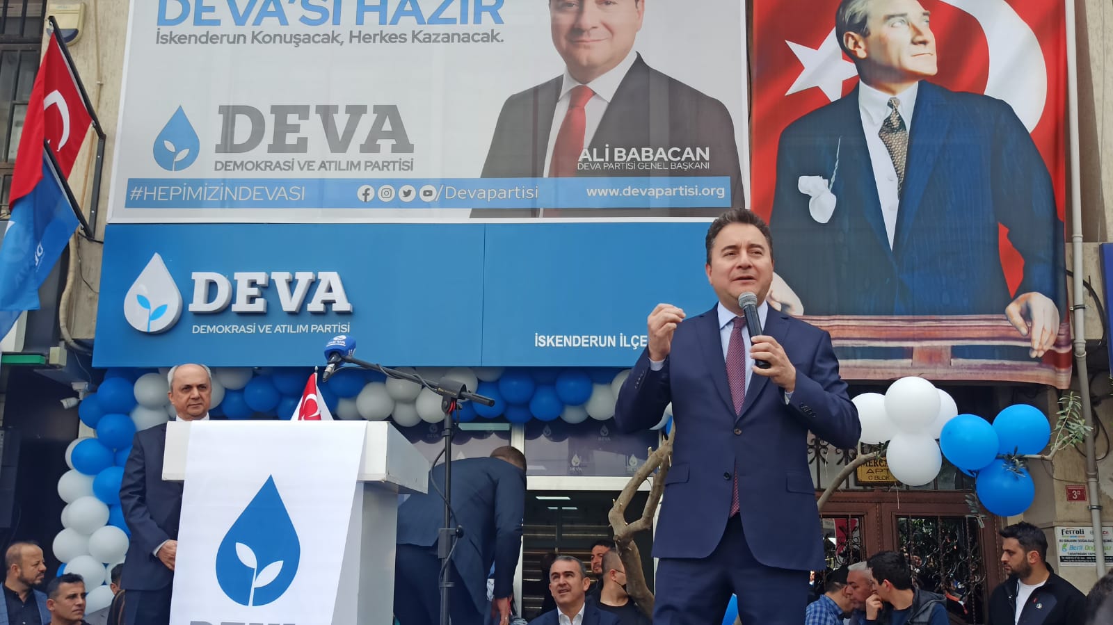 Demokrasi ve Atılım (DEVA) Partisi İskenderun İlçe Binasının açılışı, Deva Partisi Lideri Ali Babacan ve eşinin katılımıyla gerçekleştirildi. Açılışa Babacan’ın yanı sıra, Genel Başkan Yardımcısı Sadullah Ergin, Hatay İl Başkanı Sabit Coşkun, İlçe Başkanı Güven Gündüz, partililer ve çok sayıda davetli katıldı.