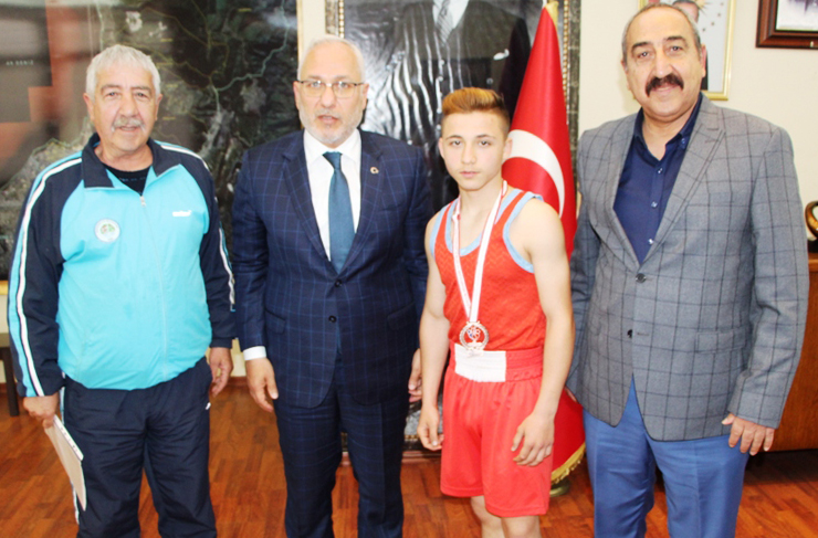 Boks Federasyonu tarafından Mersin’de düzenlenen 2019 faaliyet programında yer alan Genç Erkekler Türkiye Ferdi Boks Şampiyonasında Türkiye 3.sü olan İskenderun Belediyespor Kulübü boksörü Salim Öztürk, İskenderun Belediye Başkanı Fatih Tosyalı’yı makamında ziyaret etti.