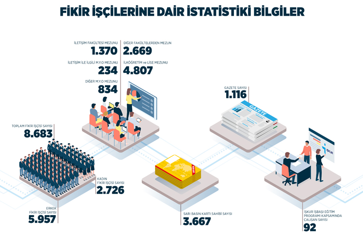 BİK, 81 ilde resmi ilan yayınlama hakkını haiz süreli yayınların sayılarına, asgari kadrolarında yer alan fikir işçilerinin cinsiyetlerine, eğitim durumlarına, sarı basın kartı sahipliği, İŞKUR İşbaşı Eğitim Programı kapsamında çalışan sayılarına dair 2018 yılı verilerini açıkladı. Önceki yıllardan farklı olarak bu yıl açıklanan istatistiklerde engelli ve emekli fikir işçilerinin de sayılarına dair bilgiler de yer aldı. Yine önceki yıllarda detaylı olarak verilmeyen eğitim durumları verileri; ilköğretim, lise, ön lisans, iletişimle ilgili ön lisans, lisans, iletişim fakültesi mezunu, yüksek lisans, doktora şeklinde ayrılarak kamuoyuyla paylaşıldı.