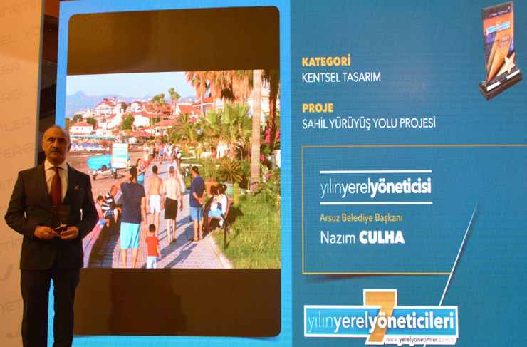 Anadolu Yerel Yönetimler Dergisi tarafından düzenlenen ve Türkiye genelinde Bir milyon yüz bin kişinin oy kullandığı ankette Kentsel Tasarım Kategorisinde “Arsuz Sahil Yürüyüş Yolu” Projesi ile  “Yılın Yerel Yöneticisi” ödülüne layık görülen Arsuz Belediye Başkanı Nazım Culha, Kayseri Erciyes Kardanadam Tesislerinde düzenlenen  Ödül Töreninde, Anadolu Yerel Yönetimler Dergisi Genel Yayın Yönetmeni Mehmet Oğuz’dan ödülünü aldı.