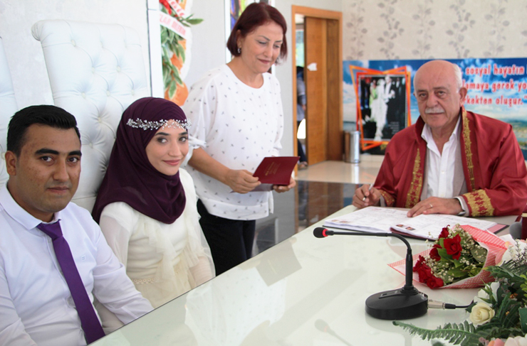 İskenderun Belediyesi Evlendirme Dairesi’nde Belediye Başkanı Seyfi Dingil’in kıydığı nikâhta 8 yıl sonra birbirlerine kavuşan çiftin mutluluğu görülmeye değerdi. Başkan Seyfi Dingil genç çiftin nikâhını kıyarak bir ömür boyu mutluluklar diledi ve fincan takımı hediye etti.