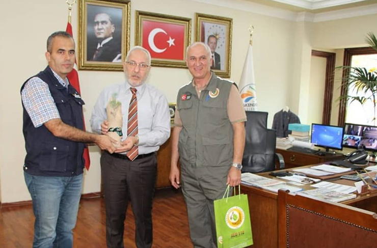 İskenderun Orman İşletme Şefi Mehmet Başaran, “11 Milyon Ağaç Bugün Fidan, Yarın Nefes” adlı proje çerçevesinde İskenderun Belediye Başkanı Fatih Tosyalı’yı ziyaret etti.