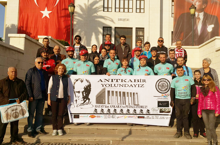 Hatay Bisiklet Spor Kulübü Derneği üyeleri, Ulu Önderimiz Gazi Mustafa Kemal Atatürk’ü ölümünün 79’uncu yıldönümünde Anıtkabir’de anmak için yola çıktı. Bu yıl 3’üncüsü düzenlenen ‘Anıtkabir Yolundayız’ adlı etkinlikte buluşan bisiklet tutkunları, Hatay’dan Ankara’ya kadar pedal çevirecek.