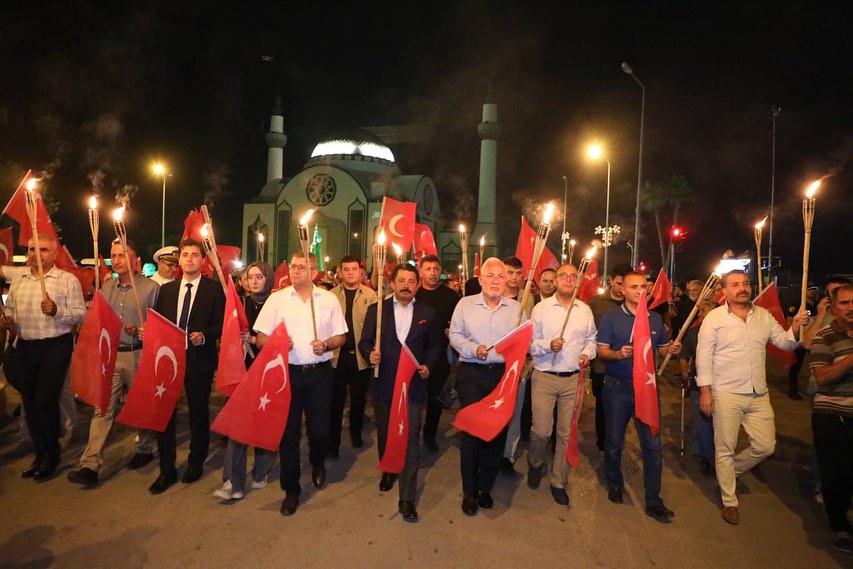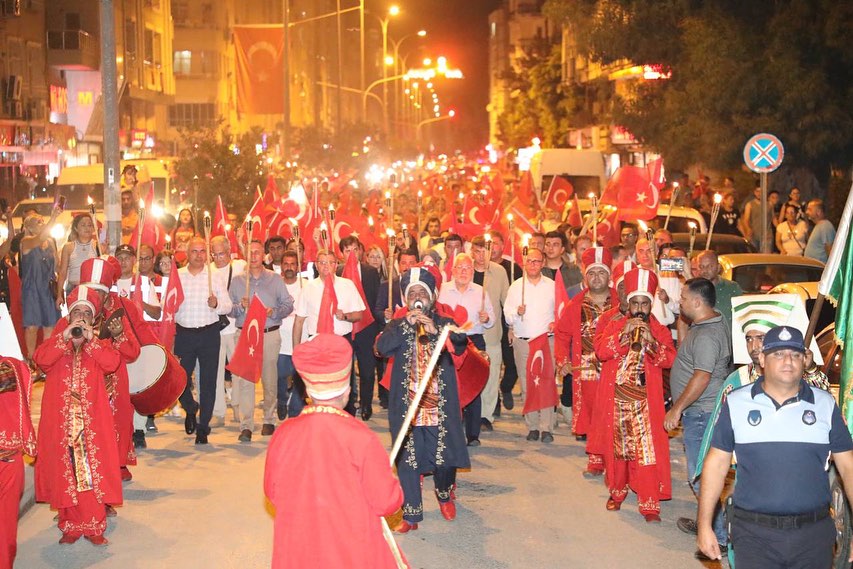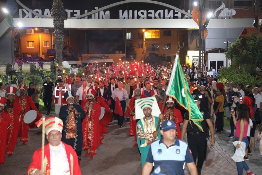 İskenderun’da düzenlenen Fener alayına Kaymakamı Murat Sefa Demiryürek, Garnizon Komutana Tuğgeneral Hakan Tutucu, Belediye Başkanı Fatih Tosyalı, askeri ve sivil erkan ve vatandaşlar katıldı. Nihal Atakaş Camii önünde bir araya gelen protokol ile vatandaşlar mehter takımının öncülüğünde Fener Caddesi’nde Millet Parkına doğru yürüdü. Ay yıldızlı şanlı Türk bayrakları ve fenerlerle yapılan korteje caddenin her iki yakasındaki kaldırımlarda bekleyen vatandaşlar da alkış temposu tutarak destek verdi. Nihal Atakaş Cami önünden başlayan Zafer yürüyüşü, Millet Parkında noktalandı.