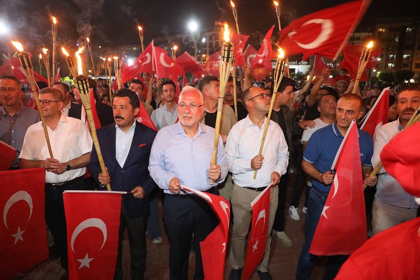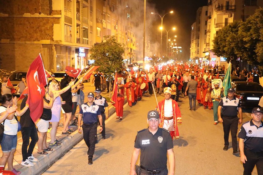 İskenderun’da düzenlenen Fener alayına Kaymakamı Murat Sefa Demiryürek, Garnizon Komutana Tuğgeneral Hakan Tutucu, Belediye Başkanı Fatih Tosyalı, askeri ve sivil erkan ve vatandaşlar katıldı. Nihal Atakaş Camii önünde bir araya gelen protokol ile vatandaşlar mehter takımının öncülüğünde Fener Caddesi’nde Millet Parkına doğru yürüdü. Ay yıldızlı şanlı Türk bayrakları ve fenerlerle yapılan korteje caddenin her iki yakasındaki kaldırımlarda bekleyen vatandaşlar da alkış temposu tutarak destek verdi. Nihal Atakaş Cami önünden başlayan Zafer yürüyüşü, Millet Parkında noktalandı.