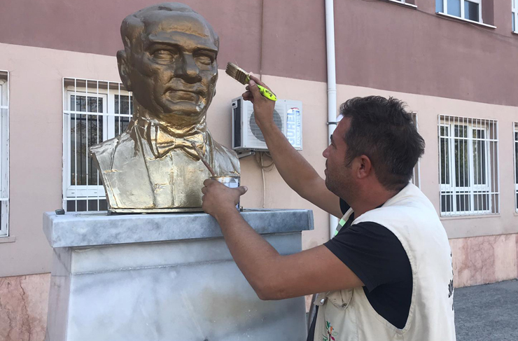 Atatürk büstlerini büyük hassasiyetle boyayan Büyükşehir ekipleri, çalışmaların il genelinde koordineli halde devam edeceğini ifade etti.