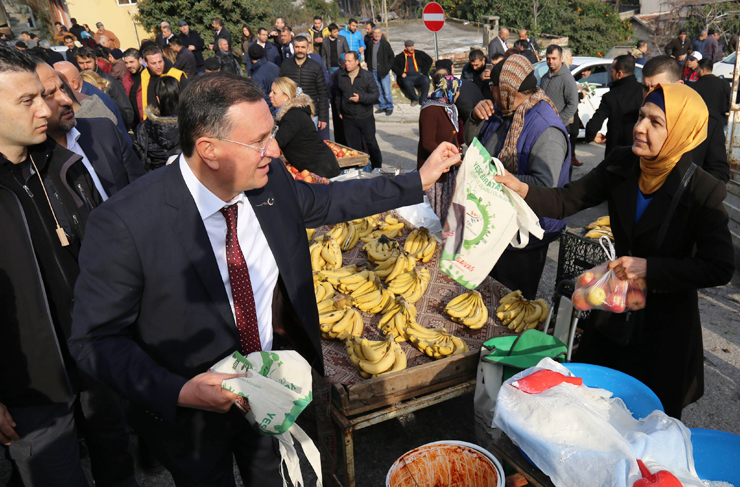 Pazarda alışveriş yapan hemşerileriyle bir araya gelen ve onlara Hatay Büyükşehir Belediyesinin bez çantalarını hediye eden Başkan Savaş, aynı zamanda pazar esnafı ile de sohbet ederek hayırlı kazanç temennisinde bulundu.