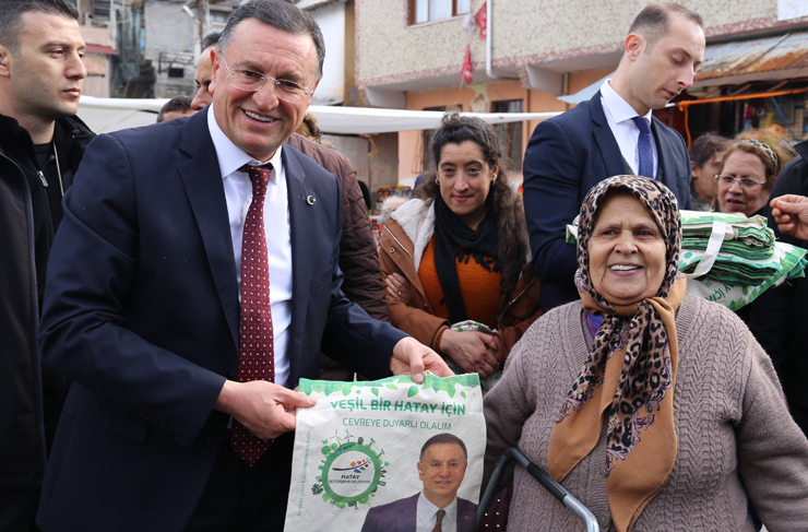 Naylon poşet kullanımının azaltılması ve doğaya zararının önüne geçilmesi için vatandaşları bez poşet ve çanta kullanmaya teşvik etmek isteyen HBB Başkanı Doç. Dr. Lütfü Savaş, Bağrıyanık Mahallesi’nde kurulan semt pazarında, Antakyalı hemşerilerine bez çanta hediye etti.