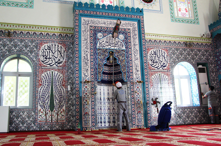 Belediye’nin Temizlik İşleri Müdürlüğü, halkın daha sağlıklı ve hijyenik bir ortamda ibadetlerini sürdürmesi için camilerin halılarını süpürülerek dezenfekte ediyor. Ayrıca, duvar, kapı, pencere ve camlar da büyük bir titizlikle temizleniyor.