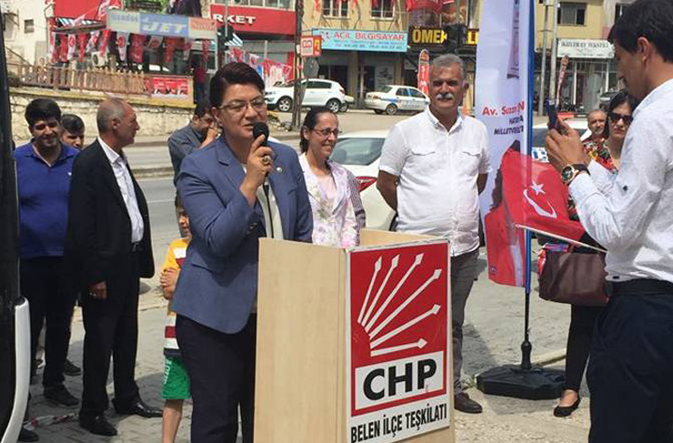 Daha sonra söz alan CHP Hatay Milletvekili adayı Suzan Şahin de, yeni ve çağdaş bir Anayasa yapılarak, kuvvetler ayrılığına dayalı güçlü bir parlamenter rejim oluşturulacağına vurgu yaparak; “Katılımcılık, birlikte yönetim ve çoğulcu demokrasi ilkeleri doğrultusunda yükseltilecek olan demokratik toplum yapımızda yerel yönetimler ve sivil toplum ön plana çıkarılacaktır. Yerel yönetimler güçlendirilecektir. Merkezde toplanmış ve verimsizliğe yol açan idari yetkiler bu yönetimlere devredilecektir. Medya siyasetin ve sermayenin güç devşirme aracı olmaktan çıkarılacaktır. Tarafsız ve sorumlu yayımcılık anlayışına uygun düzenlemeler ivedilikle yapılacaktır. Demokrasimizi, milli bütünlüğümüzü ve güvenliğimizi tehdit eden FETÖ, PKK, IŞİD ve benzeri bütün terör örgütlerine karşı tavizsiz mücadele edilecektir” diye konuştu.