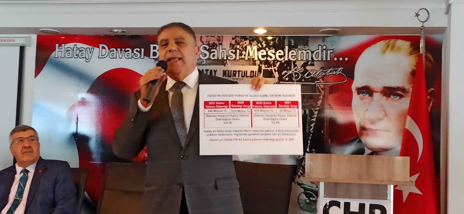 Verilen vergiler yapılan yatırımları oransal olarak anlatmak istersek, 2022’de 38 liranın 1 lirası Hatay’a 37 lirası başka yerlere gidiyor. Bir örnek daha vereyim. Hatay EXPO 2021’e devletin 5 kuruş katkısı yok. Antalya EXPO’ya oluk oluk para aktaran iktidar Hatay’ı neden yalnız bırakıyor? Sadece belediyenin imkânlarıyla Hatay’da EXPO yapılmaya çalışılıyor” şeklinde konuştu.