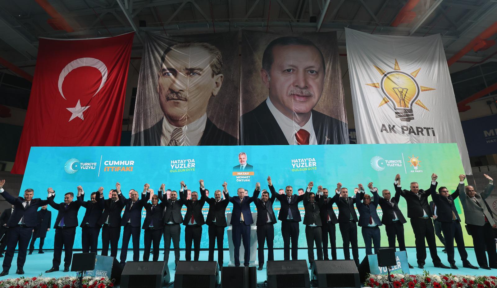 Ak Parti ve Cumhur İttifakı’nı 31 Mart seçimlerinde temsil edecek büyükşehir ve il belediye başkan adaylarını önceki hafta açıkladıklarını hatırlatan Cumhurbaşkanı Erdoğan, Hatay Büyükşehir’de Cumhur İttifakı adayı olarak Mehmet Öntürk’ü gösterdiklerini anımsattı. Öntürk, bu sırada sahneye çıkarak Cumhurbaşkanı Erdoğan ile salonu selamladı. Cumhurbaşkanı Erdoğan, Öntürk’ün Hataylıların teveccühüne mazhar olduğunu görmekten duyduğu memnuniyeti dile getirdi. Konuşmasını sürdüren Cumhurbaşkanı Erdoğan, Hatay’ın kamu yatırımlarını noksansız alsa da yereldeki vizyon eksikliği nedeniyle potansiyelini açığa çıkarmakta zorlanan bir şehir olduğunu ifade ederek; “Bir gerçeği şu anda söylüyorum, merkezi yönetimle yerel yönetim el ele vermezse dayanışma hâlinde olmazsa o şehre herhangi bir şey gelmez. Hatay’a geldi mi? Şu anda Hatay garip kaldı, Hatay mahzun kaldı. Şimdi 31 Mart akşamı yeni bir dönemi inanıyorum ki Mehmet Öntürk kardeşim ve ekibiyle ayağa kaldıracağız. Hatay uzun bir süredir iş ve icraat yerine laf üreten, CHP zihniyetinin elinde adeta heder oldu.