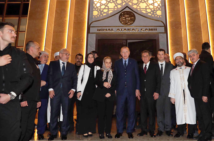 Beraberinde Bakan’lar, Ak Parti üst düzey yöneticileri, bölge milletvekilleri ve bürokratlar ile birlikte, Anıt alanındaki miting sonrasında Nihal Atakaş Camii’ne gelen Cumhurbaşkanı Recep Tayyip Erdoğan, hayırsever iş adamı Recep Atakaş, eşi Nihal ve oğlu Mustafa Atakaş tarafından karşılandı.