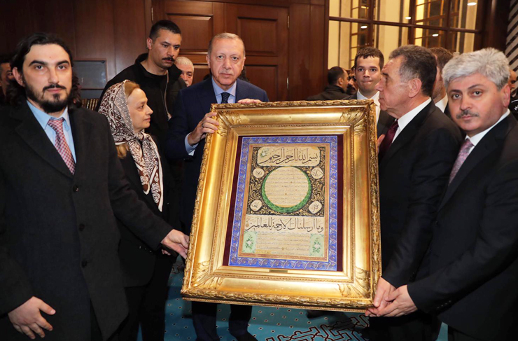 Beraberinde Bakan’lar, Ak Parti üst düzey yöneticileri, bölge milletvekilleri ve bürokratlar ile birlikte, Anıt alanındaki miting sonrasında Nihal Atakaş Camii’ne gelen Cumhurbaşkanı Recep Tayyip Erdoğan, hayırsever iş adamı Recep Atakaş, eşi Nihal ve oğlu Mustafa Atakaş tarafından karşılandı.