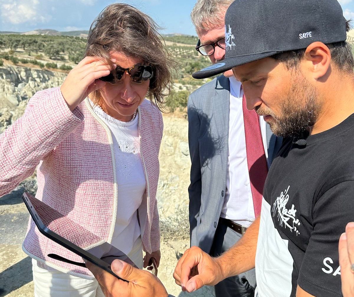 Fransa’nın Türkiye Büyükelçisi Isabelle Dumont, İsviçre’de yaşayan Fransız çağdaş sanatçı Saype’nin eserlerinden oluşan serginin açılışı vesilesiyle Hatay’a gitti.