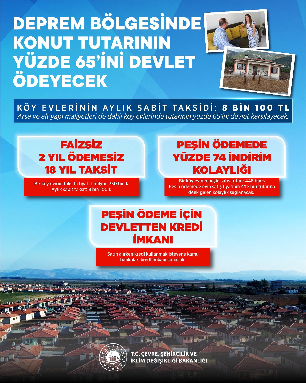 Yine köy evlerimizde altyapı maliyetlerini karşılayacak, ayrıca maliyet üzerinden yüzde elli indirim yapacağız. Orada da ödemeler on sekiz yıl boyunca 8.100 lira sabit taksitle olacak. Yine peşin almak isteyen vatandaşımız köy konutlarımızı da 448 bin liradan peşin olarak alabilecek.