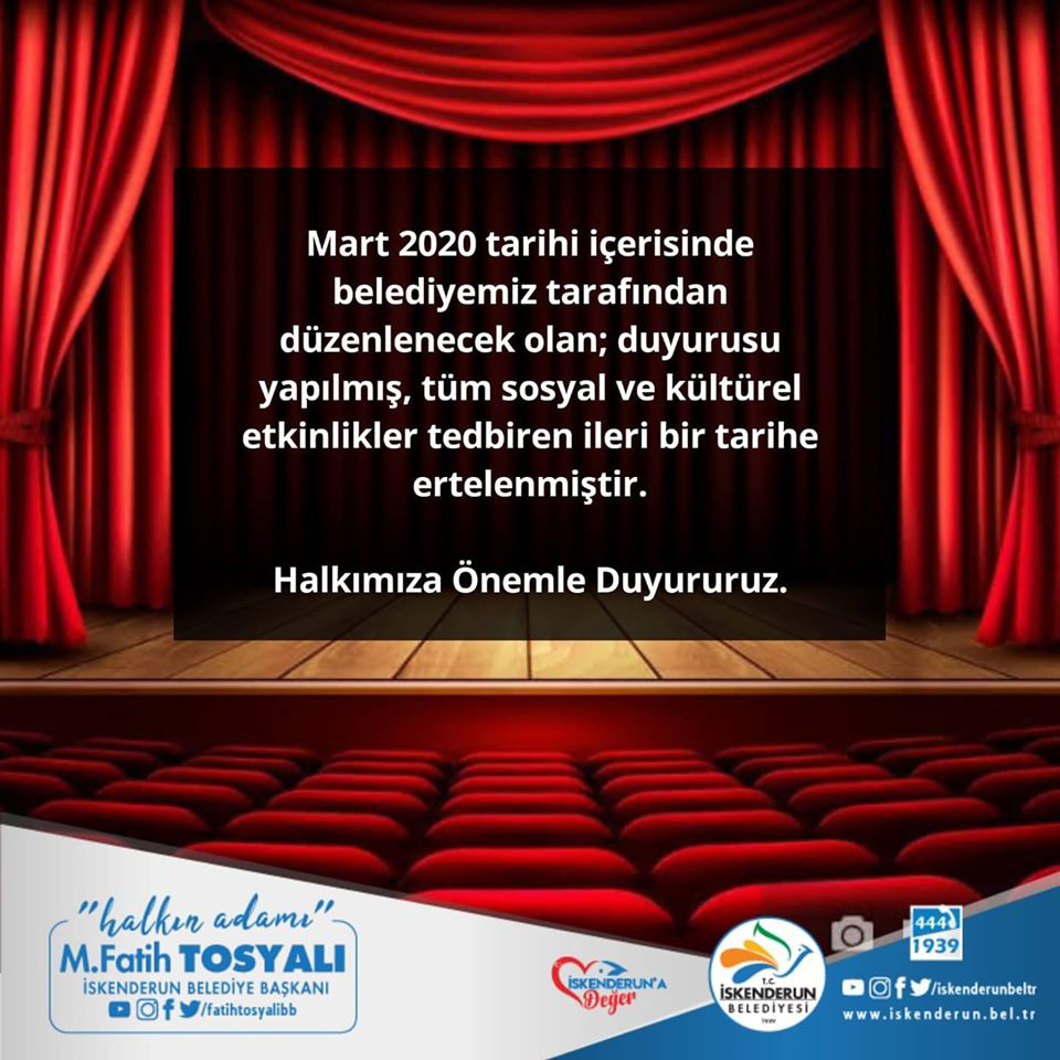 Sosyal etkinliklerin tedbiren ileri bir tarihe ertelendiğini duyuran Belediye Başkanı Fatih Tosyalı; “Mart 2020 tarihi içerisinde belediyemiz tarafından düzenlenecek olan; duyurusu yapılmış, tüm sosyal ve kültürel etkinlikler tedbiren ileri bir tarihe ertelenmiştir. Halkımıza önemle duyururuz” şeklinde konuştu.