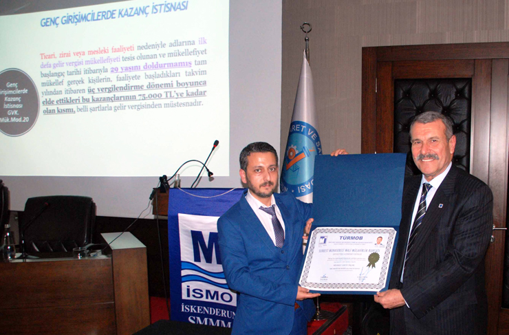 Eğitim Semineri sonunda ise İskenderun Serbest Muhasebeci Mali Müşavirler Odası Başkanı Merih Hasan Yıldırım tarafından çalışma ruhsatı Belgesi almaya hak kazanan Fatih Başar’a belgesini takdim etti. İSMO Onursal Başkanı Alaaddin Özbülbül de TÜRMOB Eğitmeni Yalçın Sütü Temiz’e vermiş olduğu eğitim seminerinden dolayı plaket takdim etti. (Haber: Doğan SÜSLÜ)