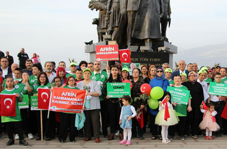 ‘21 Mart Dünya Down Sendromu Farkındalık Günü’ farkındalık yaratan down sendromlu gençler, yine farklarını ortaya koydu. Afrin’deki mücadelesini sürdüren Türk Silahlı Kuvvetlerimize destek için yürüyen down sendromlular, ellerinde zeytin dalları taşıdılar.
