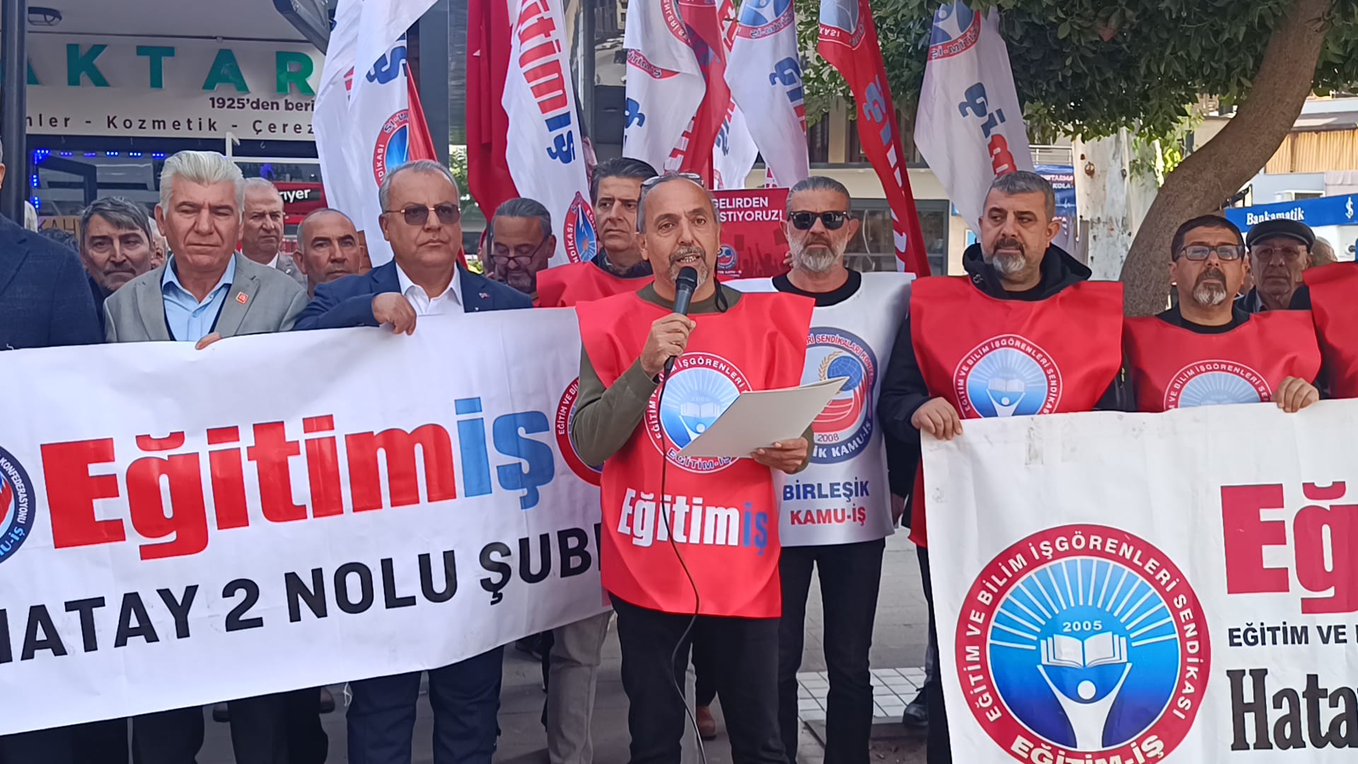 Eğitim-İş Hatay 2 No’lu Şubesi üyelerinin katılımı ile gerçekleştirilen açıklama, “Haklıyız, direneceğiz, kazanacağız” sloganlarıyla sona erdi. (Haber: Helga TERBİYELİ)