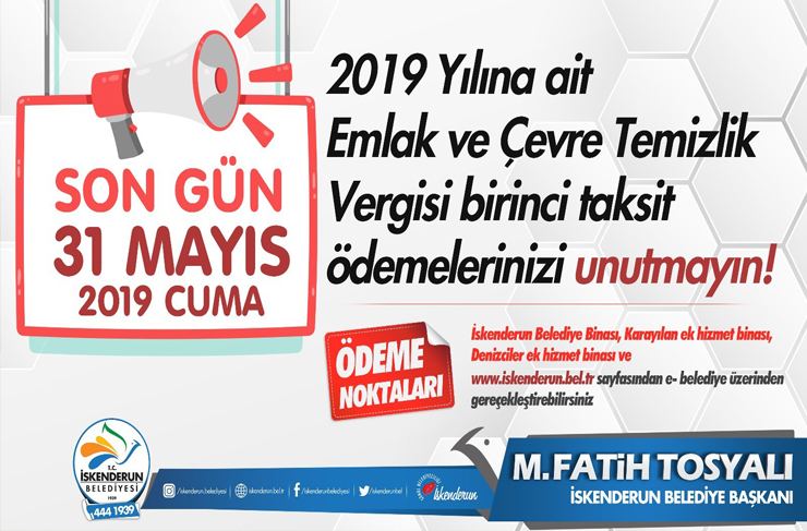 Konuyla ilgili İskenderun Belediyesi’nden yapılan açıklamada Emlak ve ÇTV vergilerinin ödemelerinin en son 31 Mayıs’a kadar yapılabileceği belirtildi.