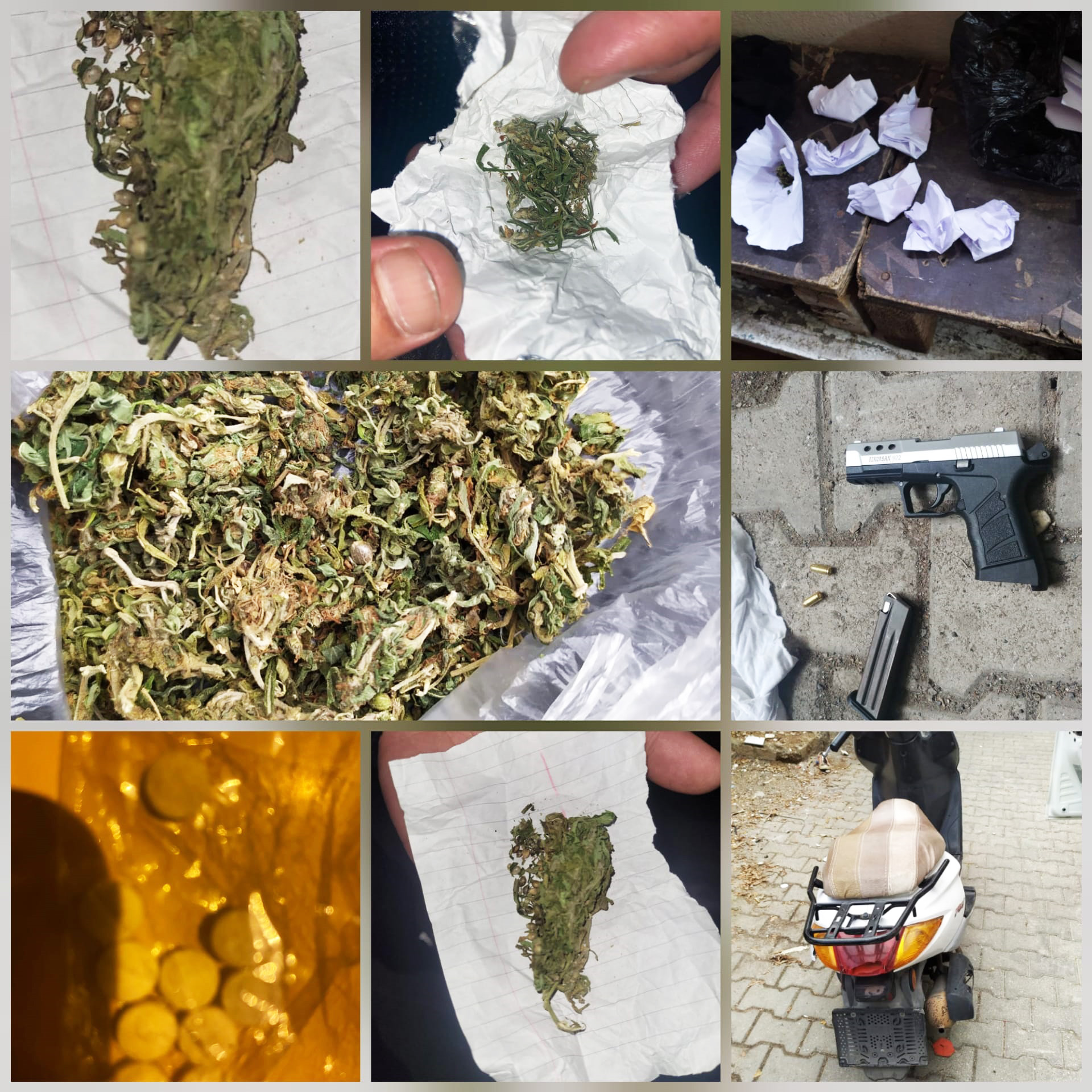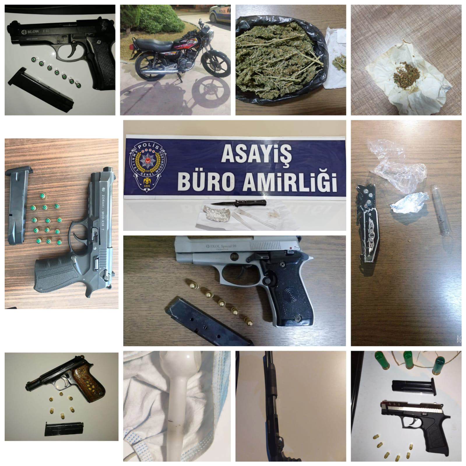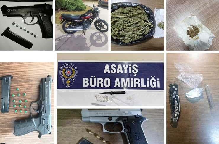 3 motosikletin trafikten men edildiği, araç sürücülerine de 47.656 TL idari para cezası uygulandığı uygulamalarda; 1 adet çalıntı motosiklet, 4 adet ruhsatsız tabanca, 2 adet kuru sıkı tabanca, 1 adet pompalı tüfek, 48 adet fişek, 151 gram esrar, 0,65 gram metamfetamin ile 3 gram eroin de ele geçirildi.