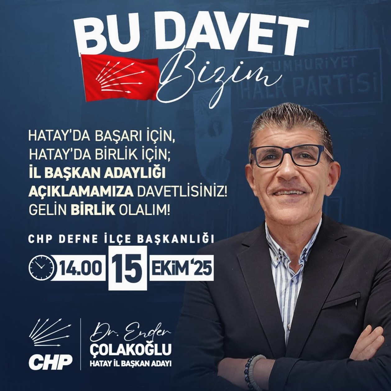 İl Başkan Adaylığı için basın açıklamasını 15 Ekim 2025 Çarşamba günü saat 14.00’da Defne İlçe Başkanlığında gerçekleştireceğini duyuran Çolakoğlu; “CHP’yi iktidara taşımak için omuz omuza çalıştığımız ve çalışacağımız tüm yol arkadaşlarımı, 15 Ekim’de Defne İlçe Başkanlığına bekliyorum. Hatay’da Başarı İçin, Hatay’da Birlik İçin; İl Başkan Adaylığı Açıklamamıza Davetlisiniz! Gelin Birlik Olalım! Kurtuluş yok tek başına! Ya hep beraber, Ya hiçbirimiz…” diyerek tüm partilileri basın açıklamasına davet etti. (Haber: İlyas Edip TERBİYELİ)