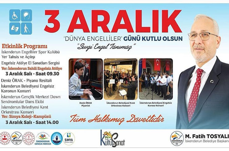 Gerçekleştirilecek etkinlikler hakkında da bilgiler veren Başkan Tosyalı; “Bu önemli günde belediye olarak çeşitli etkiler organize edildi. 3 Aralık’ta ilk olarak İskenderun Sahil Engelsiz Atölye’de saat 09.30’da Engelsiz Atölye El Sanatları Sergisi ve İskenderun Engelliler spor kulübüne yer tahsisi ve açılışı yapılacak. Ardından Simya Koleji Kampusunda saat 14.00’da Deniz Örak Piyano Resitali, İskenderun Engelsiz Koro Konseri, İskenderun Gençlik Merkezi ve Down Sendromlular Konseri, İskenderun Belediyesi Kent Orkestrası Konseri düzenlenecek. Düzenlenen tüm etkinliklere halkımız davetlidir.