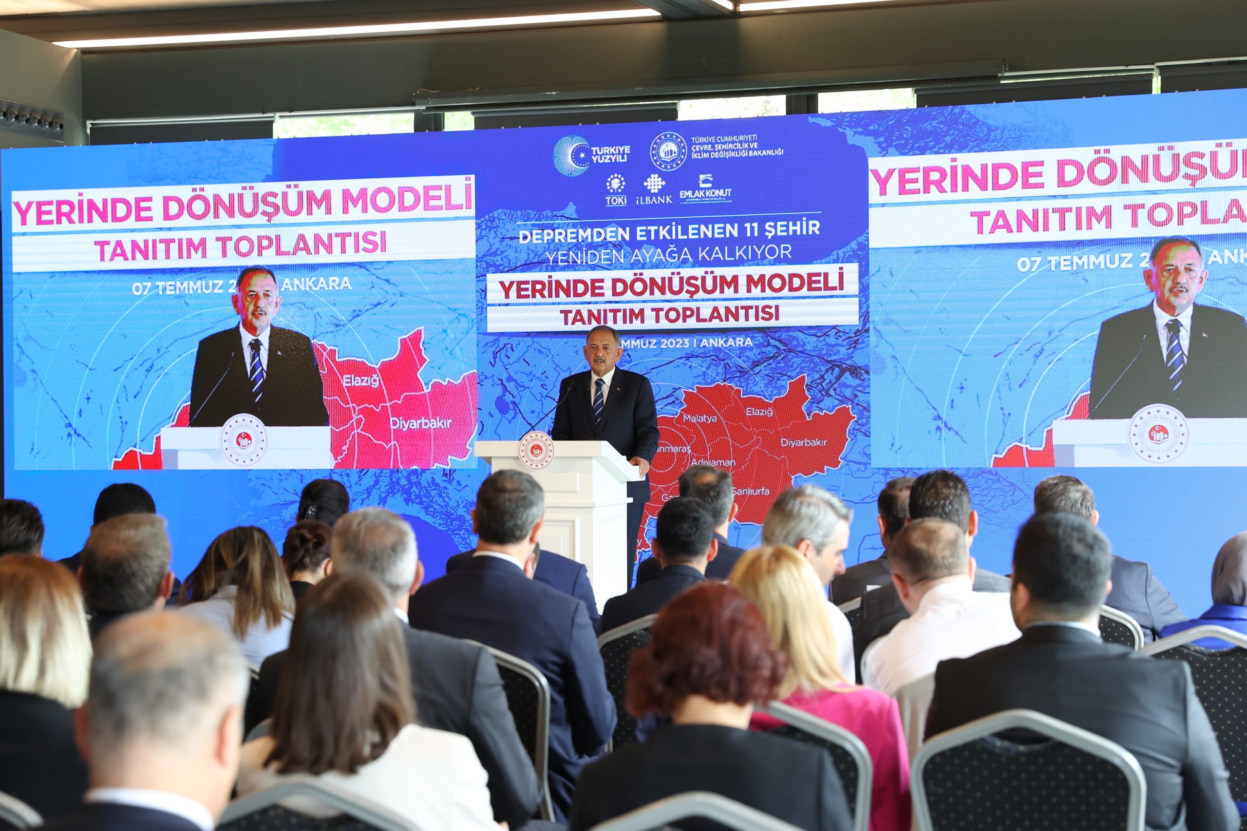 Bakan Mehmet Özhaseki, Yerinde Dönüşüm Projesi’nin başlayacağı tarihi de açıklayarak; “Bir saniye dahi kaybedemeyiz. Yerel istihdamı, ticari hayatı hareketlendirmekte kararlıyız. Konut inşa sürecini hızlandırıp şehirlerin canlılıklarını geri kazandırmalıyız. İnşallah ‘Yerinde Dönüşüm’e 15 Temmuz’da başlıyoruz. Bakanlığımızın denetiminde belediyelerimizle ve vatandaşlarımızla el ele verecek 11 şehrimizde afet dönüşümünü hızlı bir şekilde gerçekleştireceğiz” şeklinde konuştu.