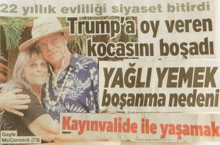 Boşanma nedenlerinin arasına bir yenisi daha aklendi: “TRUMP’u destekleyip oy vermek, boşanma nedeni oldu!” 22 yıllık kocasından boşanan ve kendini ‘İhanete’ uğramış hissettiğini belirten 73 yaşındaki kadın ‘Trump’a Oy Vermeyi’ aynen evlilikteki gibi eşler arasındaki ‘Aldatmaya’ benzetmiş olmalı! ‘Yıllanmış evliliği siyaset bitirdi!’ Trump uğruna boşanmaya değer mi?