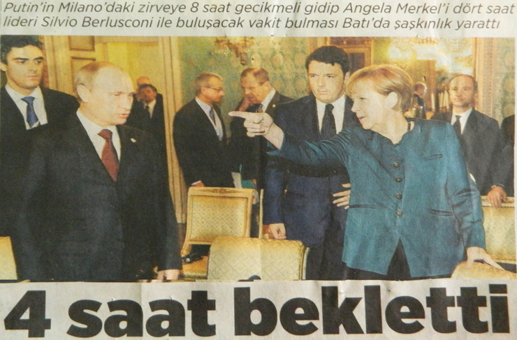 Merkel (Almanya Başbakanı): “Bay Putin, bir bayan 4 saat bekletilir mi? Çok geç kaldın, beklemekten ‘Ağaç’ oldum! Bu saatten sonra seninle toplantı yapamam. Bu durumda aklıma Ajda Pekkan’ın şarkısı geldi: ‘Olmaz artık! Kapı açık, arkanı dön ve çık. İstenmiyorsun artık!’ Sana kapıyı gösteriyorum. İşte kapı, lütfen arkanı dön ve çık!”