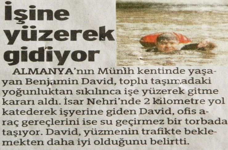 Almanya’nın Münih kentinde yaşayan David, ‘Toplu Taşımadaki’ yoğunluktan sıkılınca, işine ‘yüzerek’ gitme kararı aldı. İstanbul’da yaşayan vatandaşlara tavsiyemiz, sizde yüzerek işinize gidin. Bir taşla üç kuş vurursunuz. ‘Hem zaman kaybı önlenir, hem dolmuş parası cebinizde kalır, hem de spor yapmış olursunuz…’