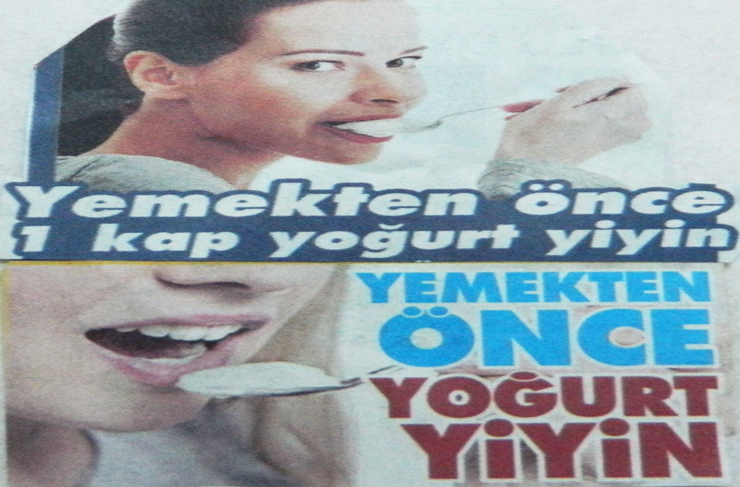 Diyetisyenlerden “yemekten önce 1 kap yoğurt yiyin” önerisi! Yoğurt rehavete ve uykuya neden olur. Siyasetçiler bu öneriye sıcak bakar. Çünkü vatandaşı uyutmak için ele geçmez bir fırsat. Yoğurt yerine çay ve kahve için ki, sizi hep “uyanık” tutsun. Memlekette olup bitenleri öğrenme fırsatı yakalarsınız.
